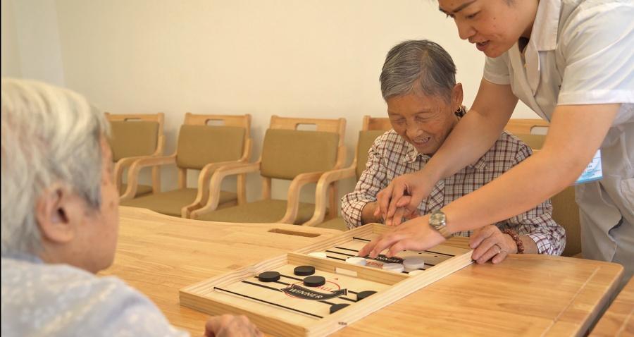 走进医养中心,这里内设食堂、老年活动室、中医馆、康复治疗室与针灸推拿室,舒适洁净的居住环境让人倍感温馨,常用家电一应俱全,每个房间都配备了紧急呼叫系统、防滑地板和适老化扶手,并有多种房型可精准满足不同的居住需求。“每间房都以‘某某爷爷(奶奶)的家’命名,就是想让老人们住进来就像在自己家一样。”护士长彭松介绍道。针对失能老人的特殊照护需求,医养中心配备洗浴床、洗浴椅,有效解决他们的洗浴难题;电动辅助站立轮椅的投入使用,能帮助进行站立训练,有效锻炼腿部肌肉,延缓关节硬化,让照护更具专业性与人文关怀。中心公共区域配备洗衣机、热水炉,从饮食到休闲再到日常起居,细致满足生活需求。